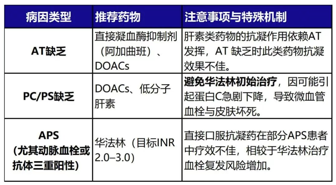针对抗凝蛋白缺乏和抗磷脂综合征,结合指南的抗凝药物选择与注意事项如下表: