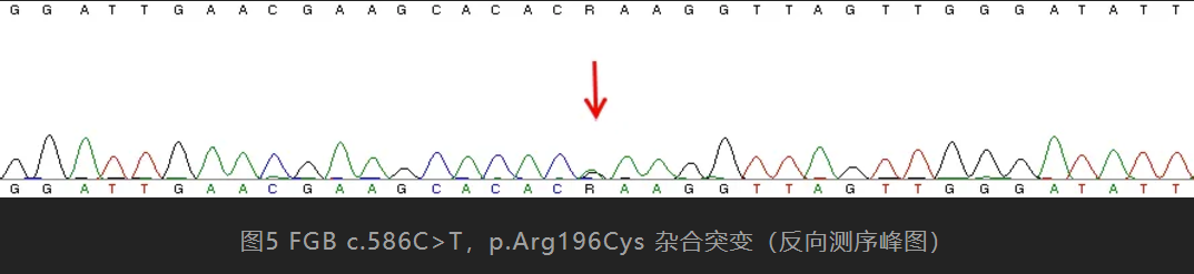 之后进行了FIB基因检测,发现存在Bβ166Arg->Cys突变(如图5),证实该患者为遗传性异常纤维蛋白原血症患者,即Fibrinogen Longmont。
