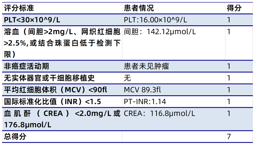 患者存在“血小板减少(PLT 16×10⁹/L)+微血管病性溶血性贫血(MAHA)+神经精神症状+肾功能损害”四联征,符合TTP典型临床表现。PLASMIC评分(具体细节见下表), 评分结果为7分,TTP高度可能,需立即进行血浆置换,送检血管性血友病因子裂解酶(ADAMTS 13)检测,立即向家属告知患者病情,表示患者病情危重,死亡风险高。