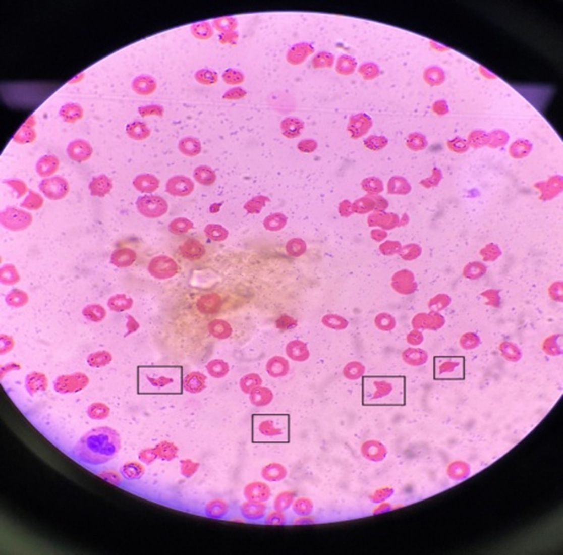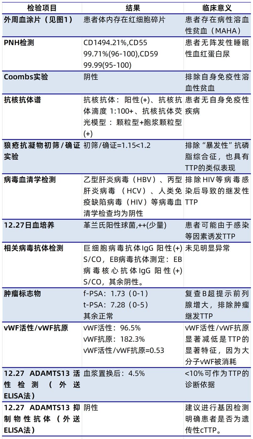 结合外周血涂片可见红细胞碎片(裂红细胞比例3.5%,图1),临床于ADAMTS13结果回报前启动血浆置换治疗。